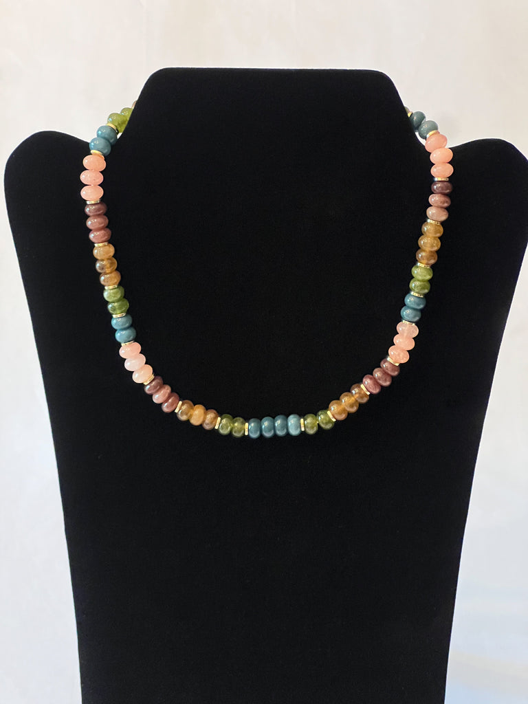 Brown, Sage, Turquoise, pink, and gold stone beaded necklace.  Approximately 17" long with an additional 2.5" extender.
