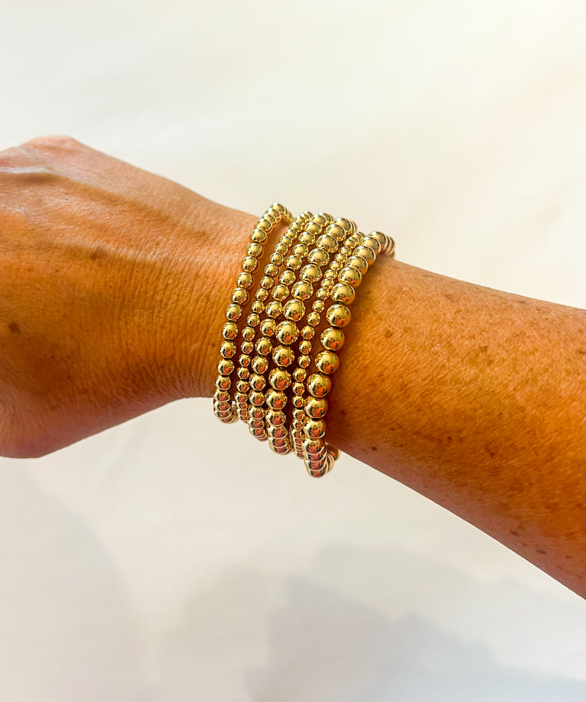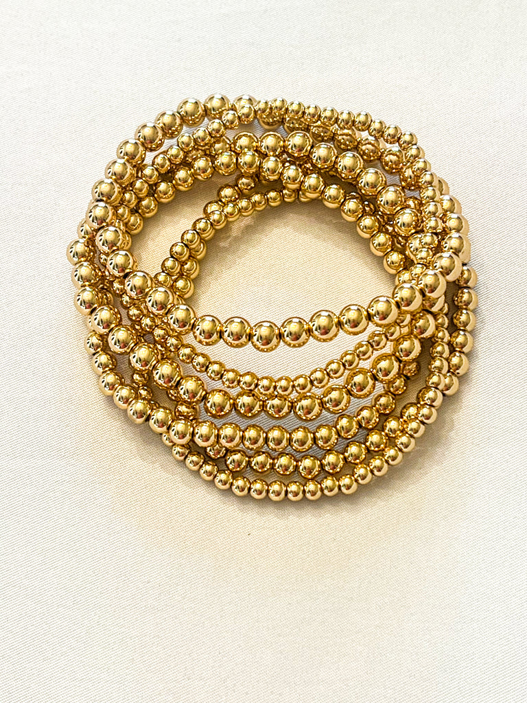 Water resistant set of 6 gold beaded stretch bracelets. The beads are 3, 4, and 6 mm in diameter.
