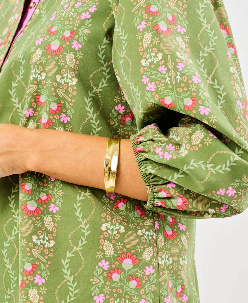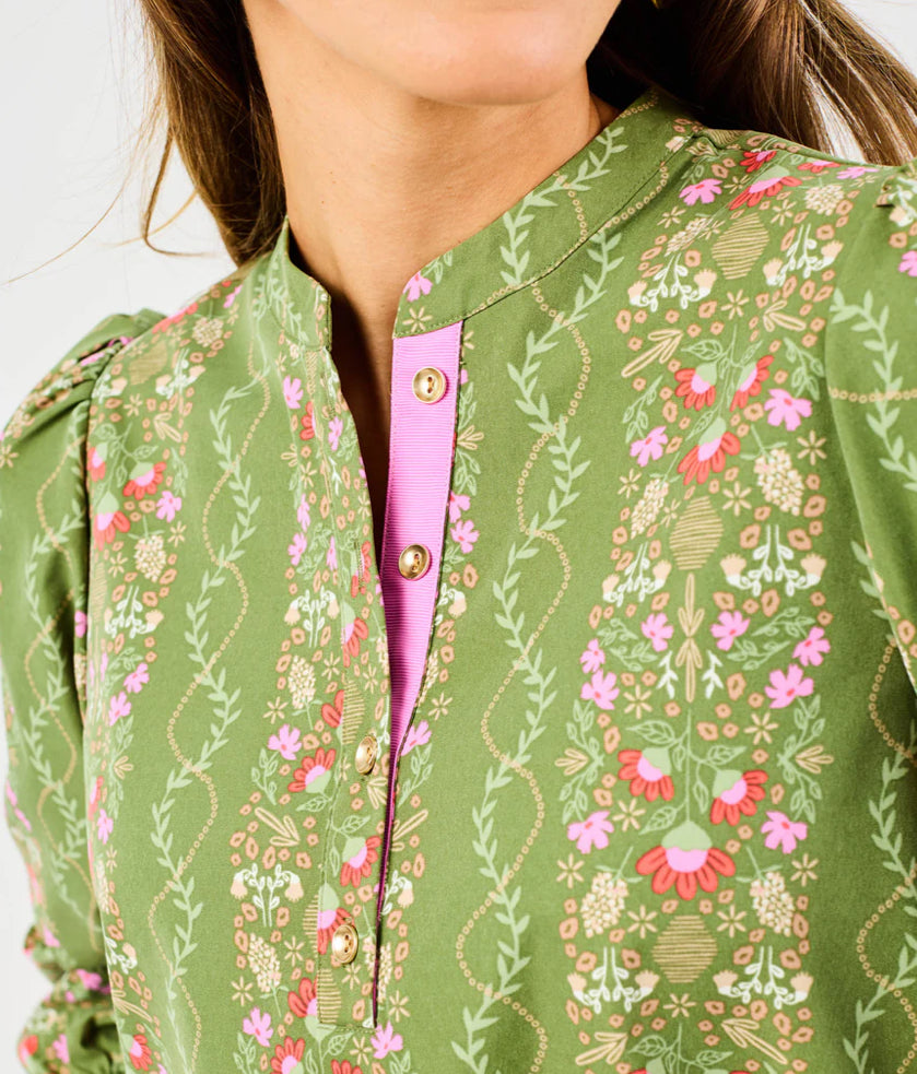 This top has a gorgeous olive green print and features a contrasting ribbon trim at the placket and button front details. It has three-quarter length sleeves with elastic cuffs that provide a flattering fit, while the side slits at the hem add a touch of movement and ease.
