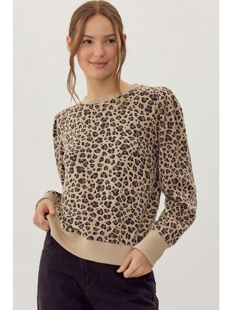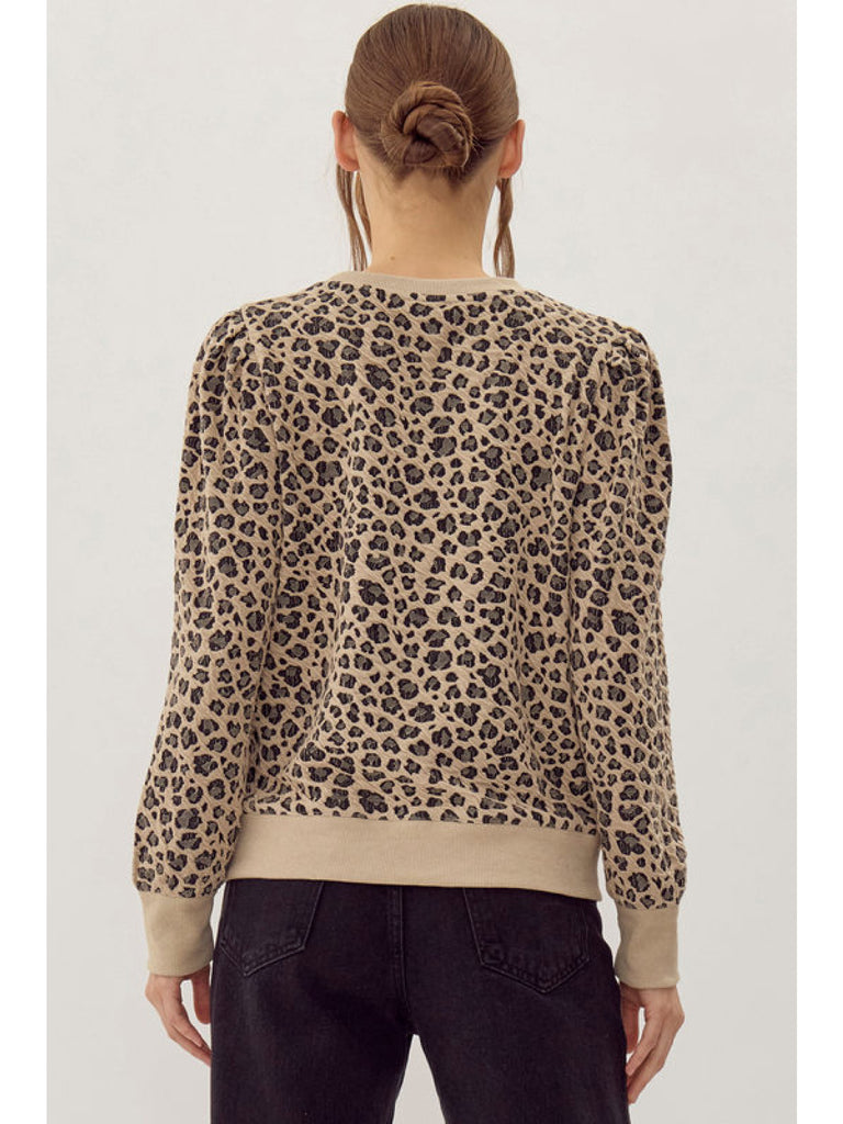 A leopard pullover top with long puffed sleeves, and ribbing at the sleeve ends and hemline.