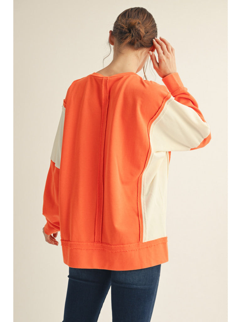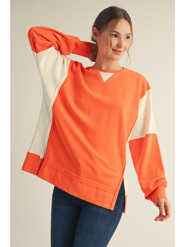 Orange and white long sleeves color block gameday top with raw cut detail, v-notched neck, and a slit hem.