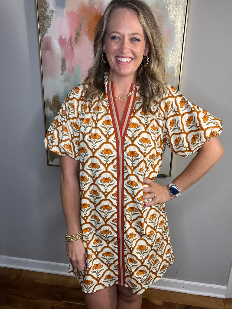 A beautiful botanical print short puff sleeve mini dress featuring multicolor contrast binding trim and ruffled neckline with V-neck. It has side pockets and it is lined.