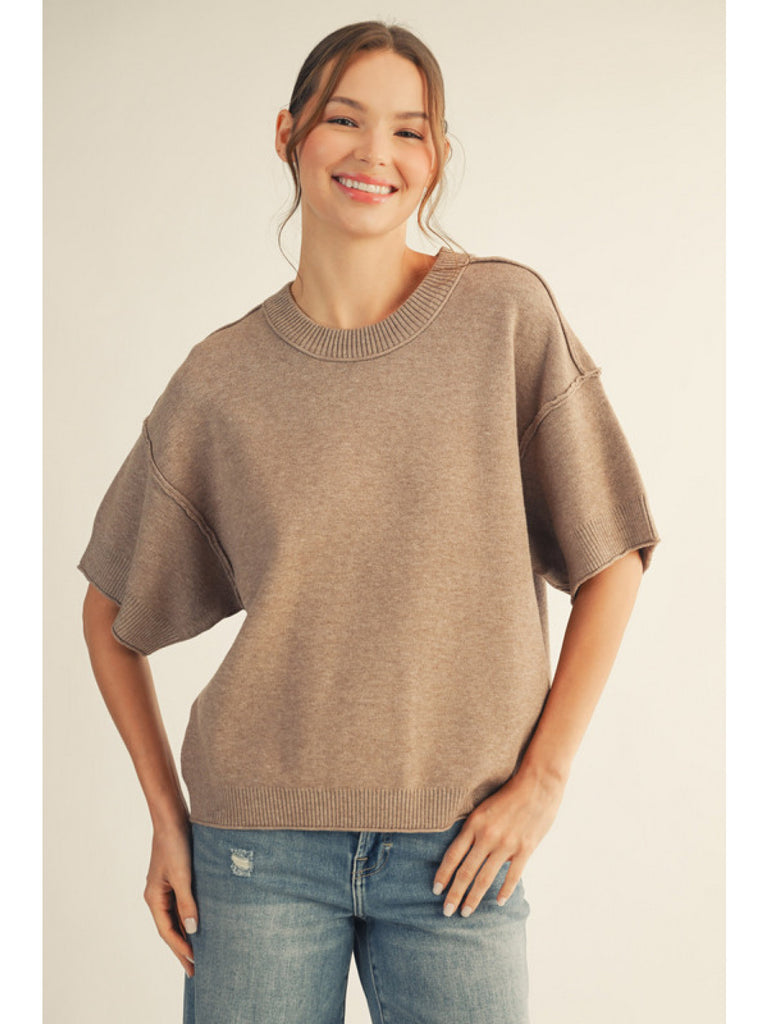 A comfy mocha sweater with a drop shoulder and raw edge detail.