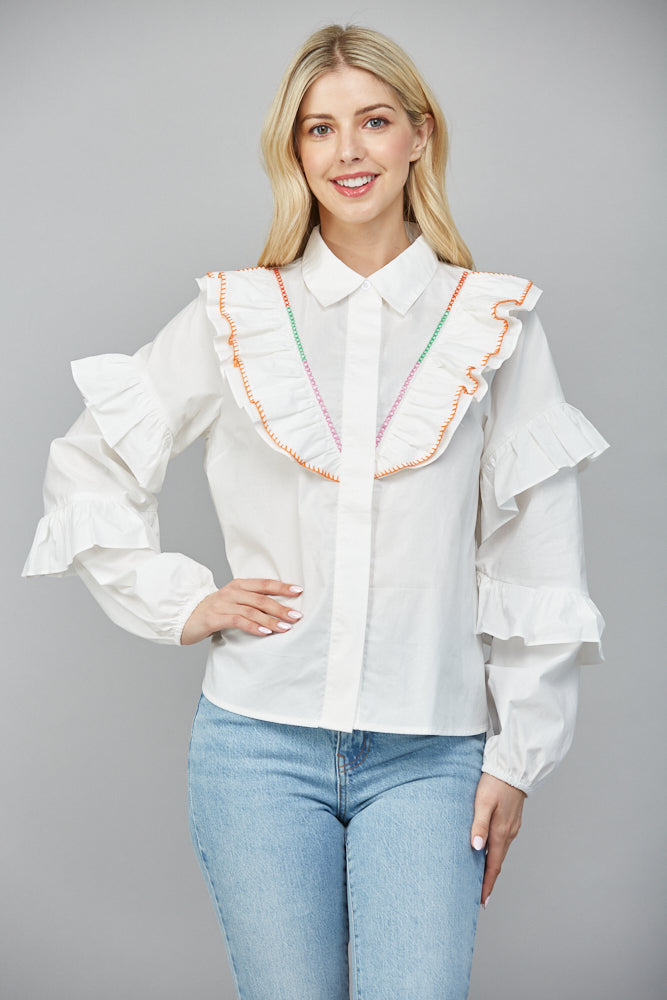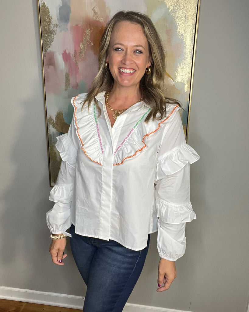 The colorful contrasting stitch and ruffle details add a fun twist to the classic white button down top.