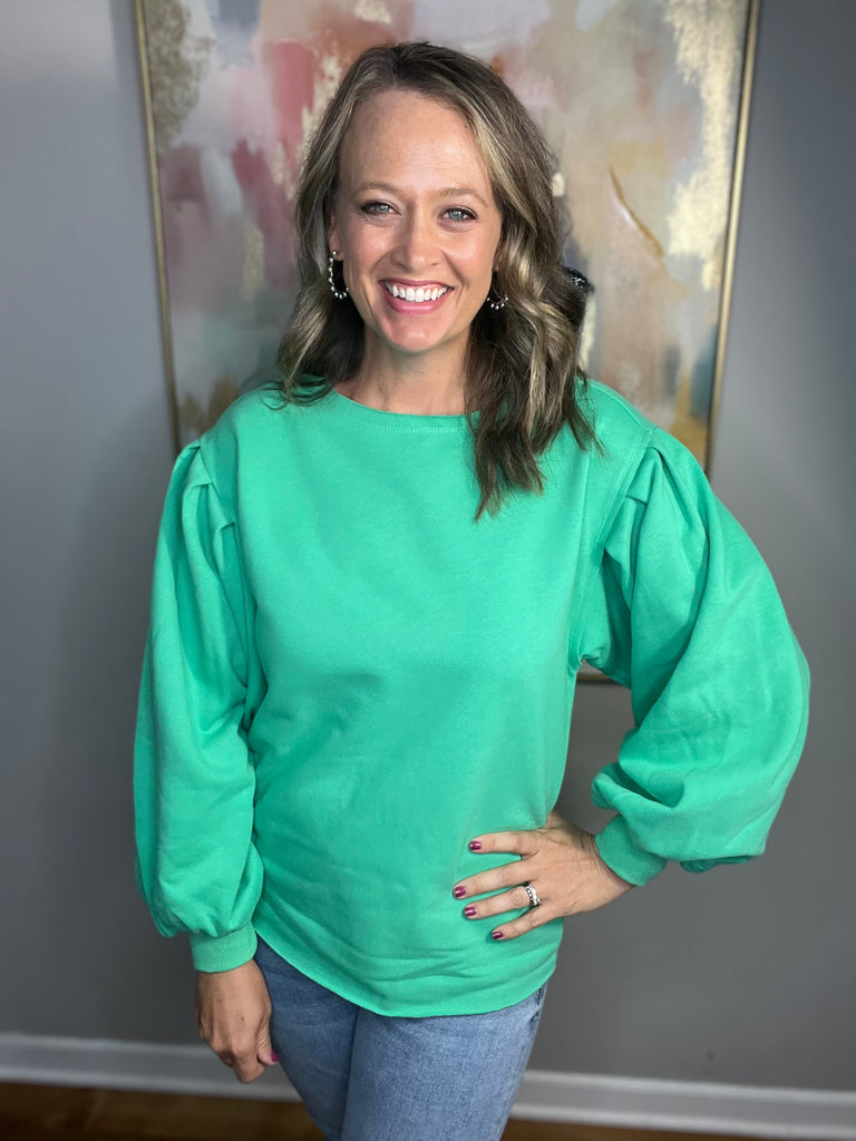 Pastel jade green loose-fitting sweatshirt. It has bubble sleeves and a round neck.