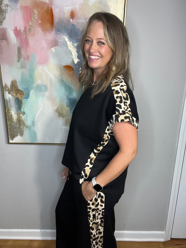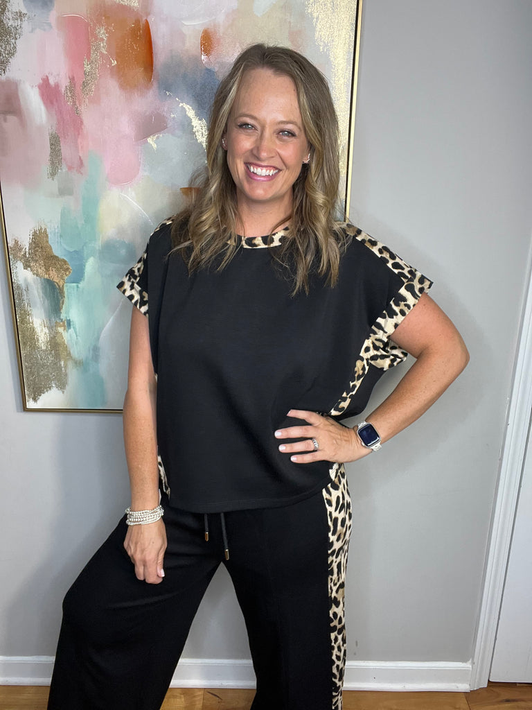 Black solid knit pants set that features a leopard contrasting accent for a bold pop. The pants are high-waisted with a drawstring and side pockets.