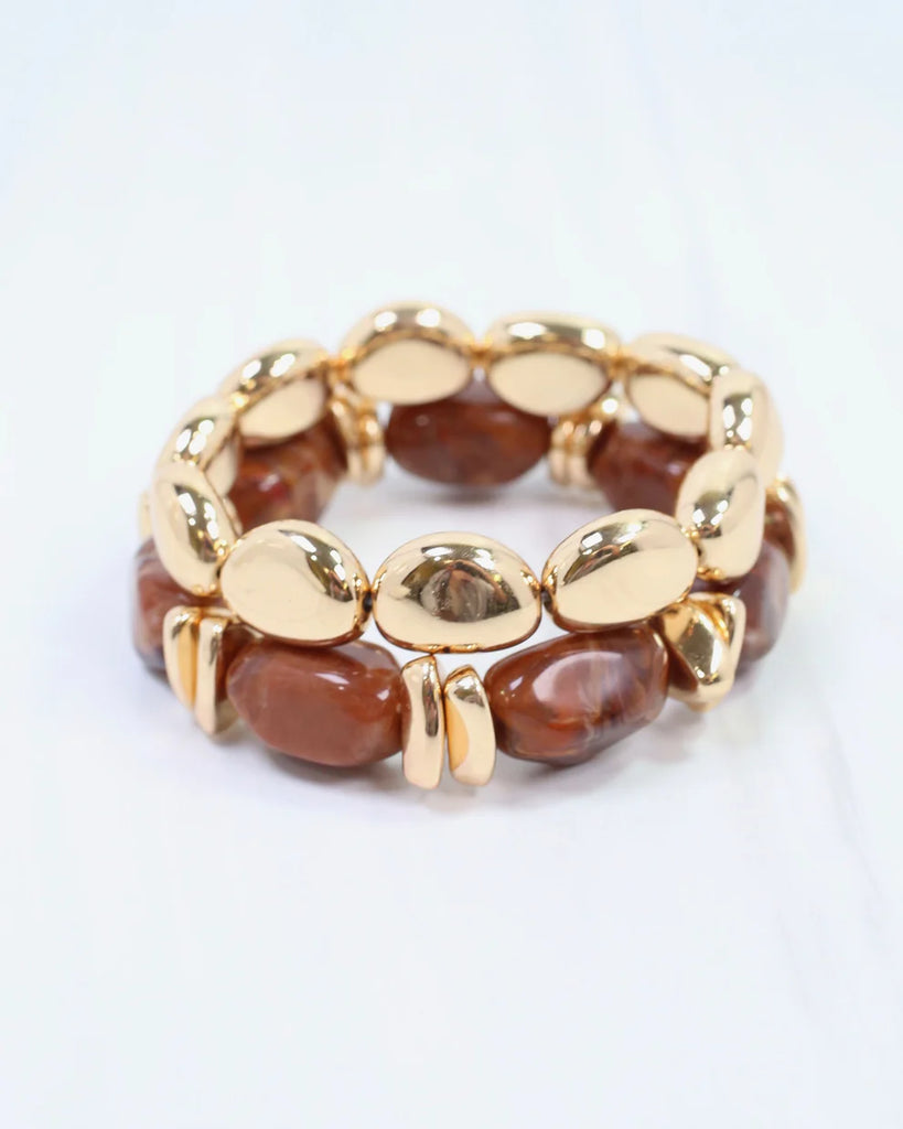 One bracelet is adorned with a mix of gold and warm brown stones, and it is paired with a sleek all-gold bracelet.  Both bracelets have stretch.