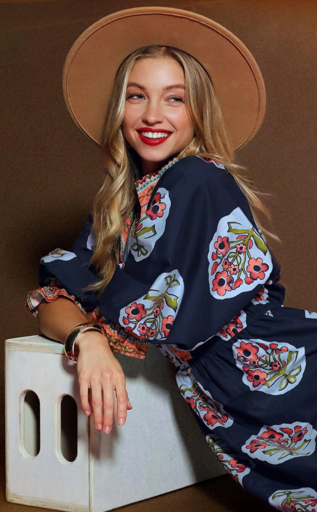 A flower patch V-neck midi dress. It has long sleeves and a split neckline with a ruffled stand collar.