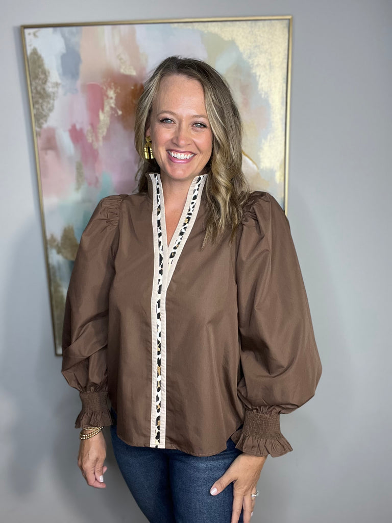 A mocha solid long sleeve top featuring animal printed contrast at the front placket and neckline. It has smocked cuffs and a ruffled mock neck.